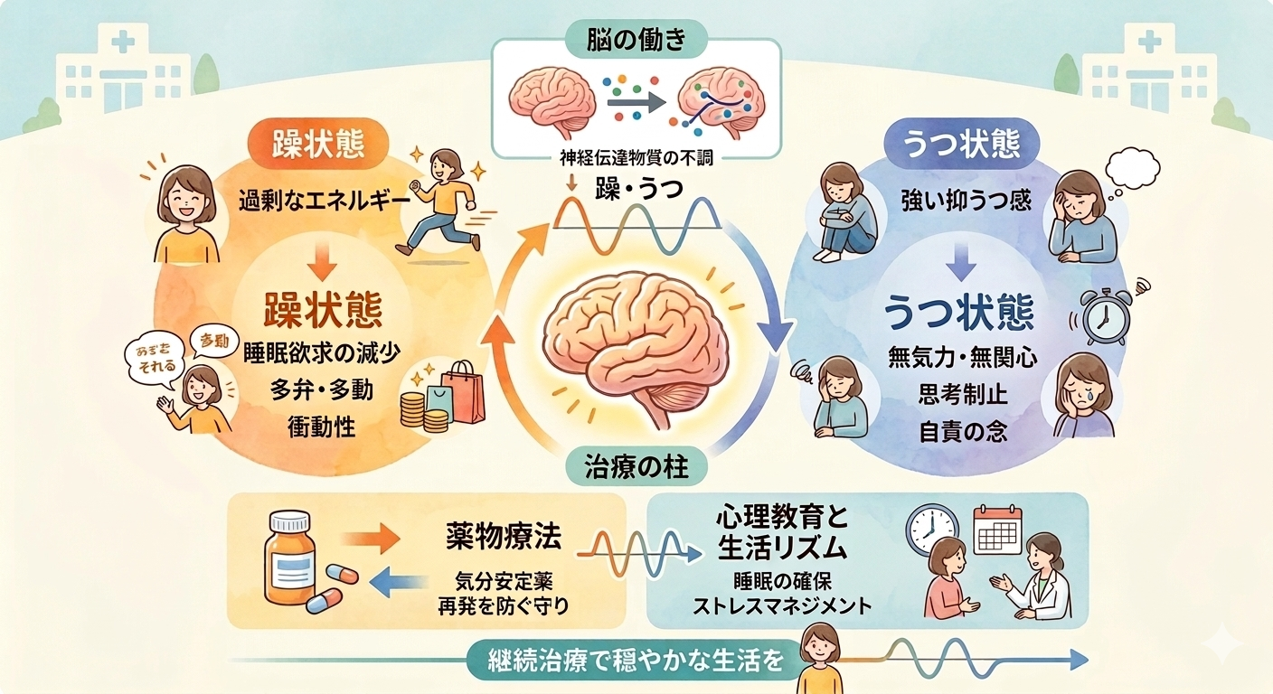 双極症(双極性感情障害、躁うつ病)は、うつ状態と躁状態の2つの気分症状が交互に現れる脳の病気です。